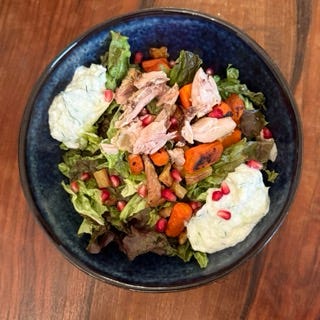 Panfried Brussel Sprouts with Roast Chicken, dill yoghurt and pomegranate