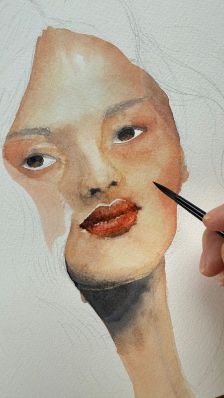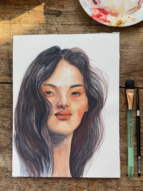 Inspired by a few artists I've seen lately, I thought I would incorporate their techniques and attempt a new style. So the challenge to myself this week was to use only three colours to paint a portrait. Plus to make it more fun - only doing heavy washes and less layers. Kind of the opposite of what I regularly do in my portraits.